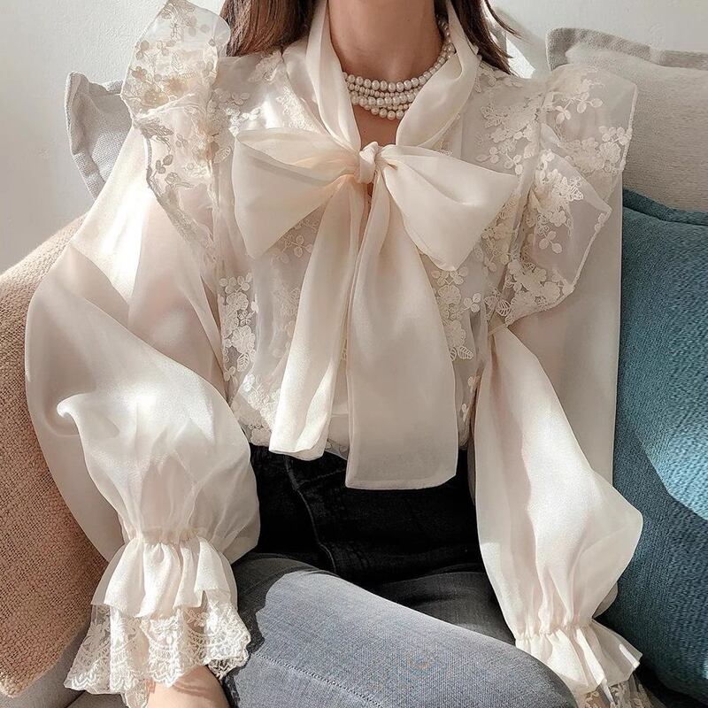 トップス シャツ ブラウス 長袖 レース フリル シフォンブラウス レディース