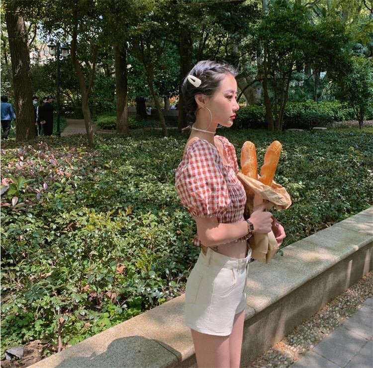 ラインを美しく演出 一言ネックライン へそ レトロ チェック柄 ハイウエスト 半袖 キクラゲ トップス