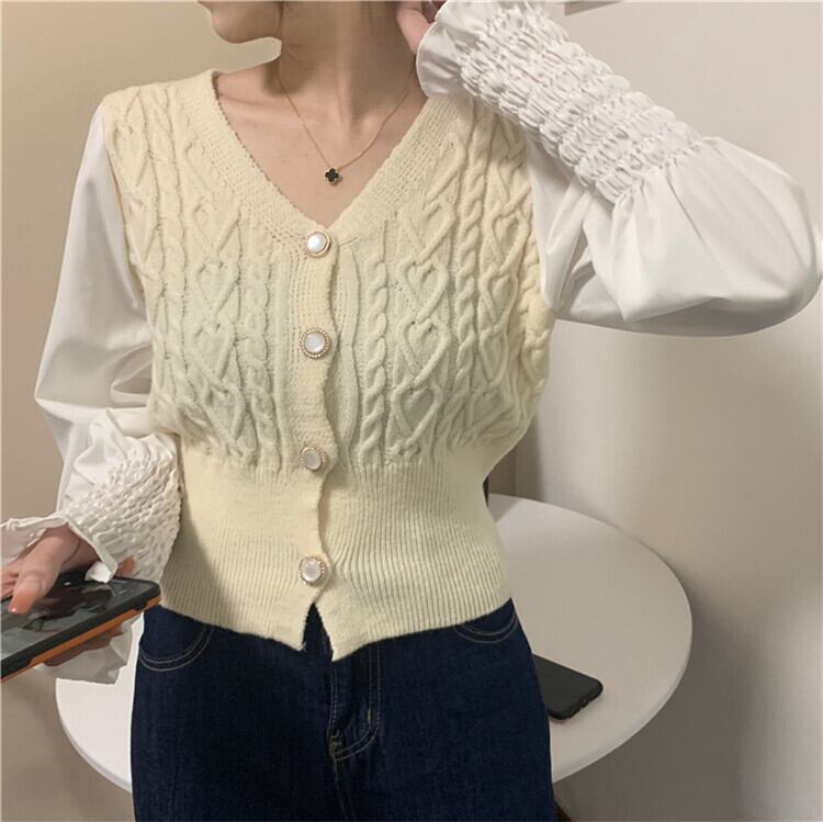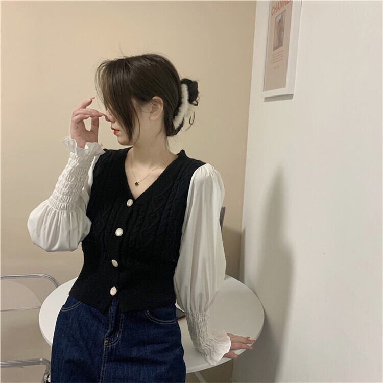 韓国ファッション 春 秋 新スタイル Vネック 長袖 縫付 ニットトップス 気質 スリム